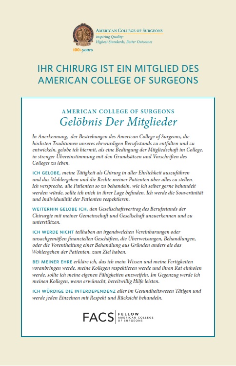 Mein Gelöbnis als Fellow of American College of Surgeons ist wie gefolgt: *In Anerkennung, der Bestrebungen des American College of Surgeons, die höchsten Traditionen unseres ehrwürdigen Berufsstands zu entfalten und zu entwickeln, gelobe ich hiermit, als eine Bedingung der Mitgliedschaft im College, in strenger Übereinstimmung mit den Grundsätzen und Vorschriften des Colleges zu leben. Ich gelobe, meine Tätigkeit als Chirurg in aller Ehrlichkeit auszuführen und das Wohlergehen und die Rechte meiner Patienten über alles zu stellen. Ich verspreche, alle Patienten so zu behandeln, wie ich selber gerne behandelt werden würde, sollte ich mich in ihrer Lage befinden. Ich werde die Souveränität und Individualität der Patienten respektieren. Weiterhin gelobe ich, den Gesellschaftsvertrag des Berufsstands der Chirurgie mit meiner Gemeinschaft und Gesellschaft anzuerkennen und zu unterstützen. Ich werde nicht teilhaben an irgendwelchen Vereinbarungen oder unsachgemäßen finanziellen Geschäften, die Überweisungen, Behandlungen, oder die Vorenthaltung einer Behandlung aus Gründen anders als das Wohlergehen der Patienten, zum Ziel haben. Bei meiner Ehre erkläre ich, das ich mein Wissen und meine Fertigkeiten voranbringen werde, meine Kollegen respektieren werde und ihren Rat einholen werde, sollte ich meine eigenen Fähigkeiten anzweifeln. Im Gegenzug werde ich meinen Kollegen, wenn erwünscht, bereitwillig Hilfe leisten. Ich würdige die Interdependenz aller im Gesundheitswesen Tätigen und werde jeden Einzelnen mit Respekt und Rücksicht behandeln.